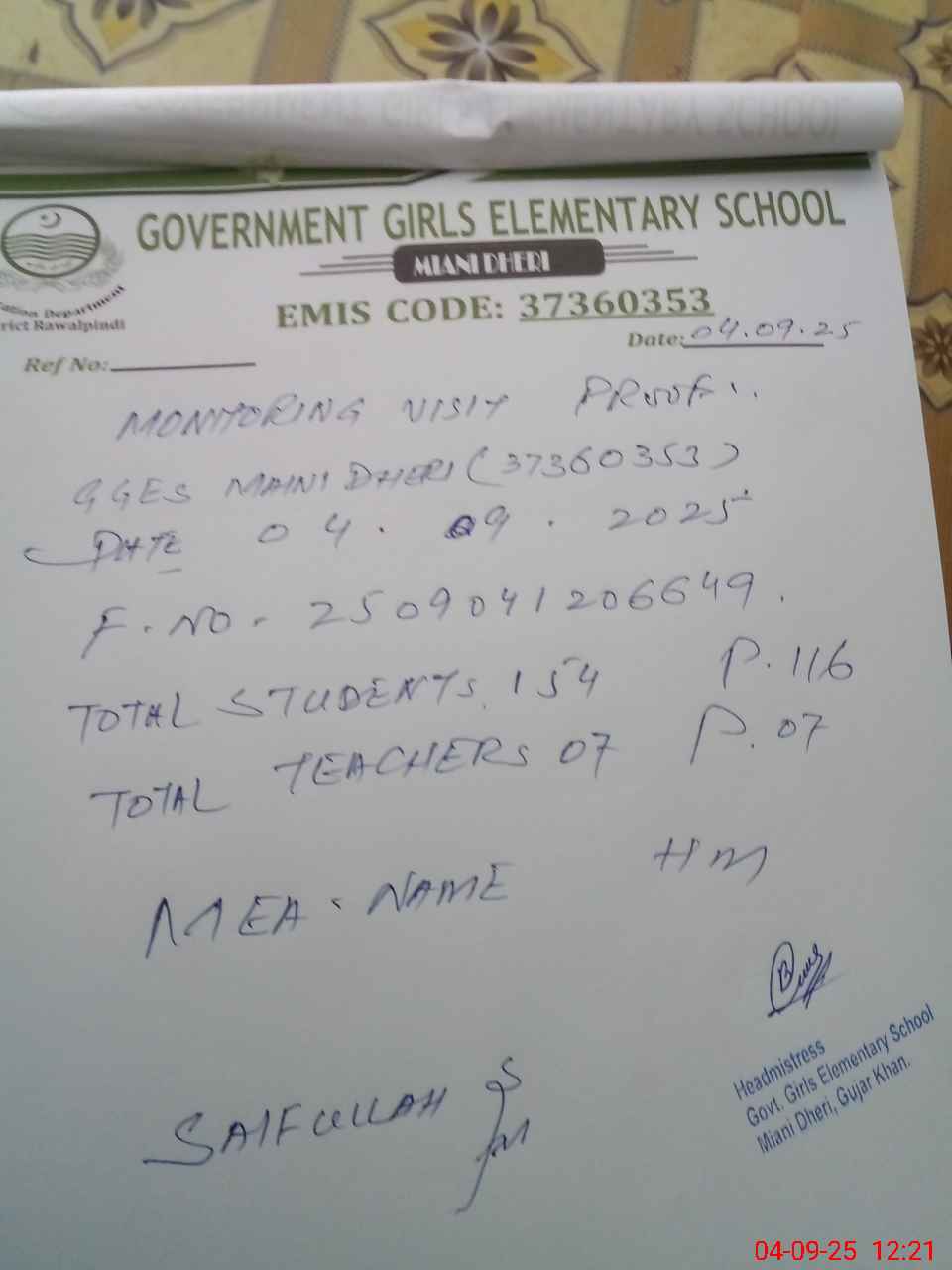 | Attendance Register | Head Teacher | MEA with School | Visit Proof |