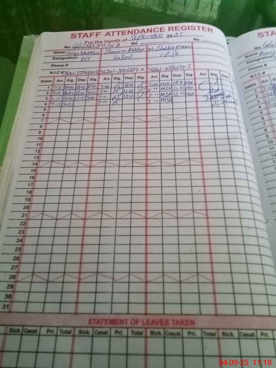 | CNIC | Full Name | Designation | R/C | Absence During Last Calender Month |