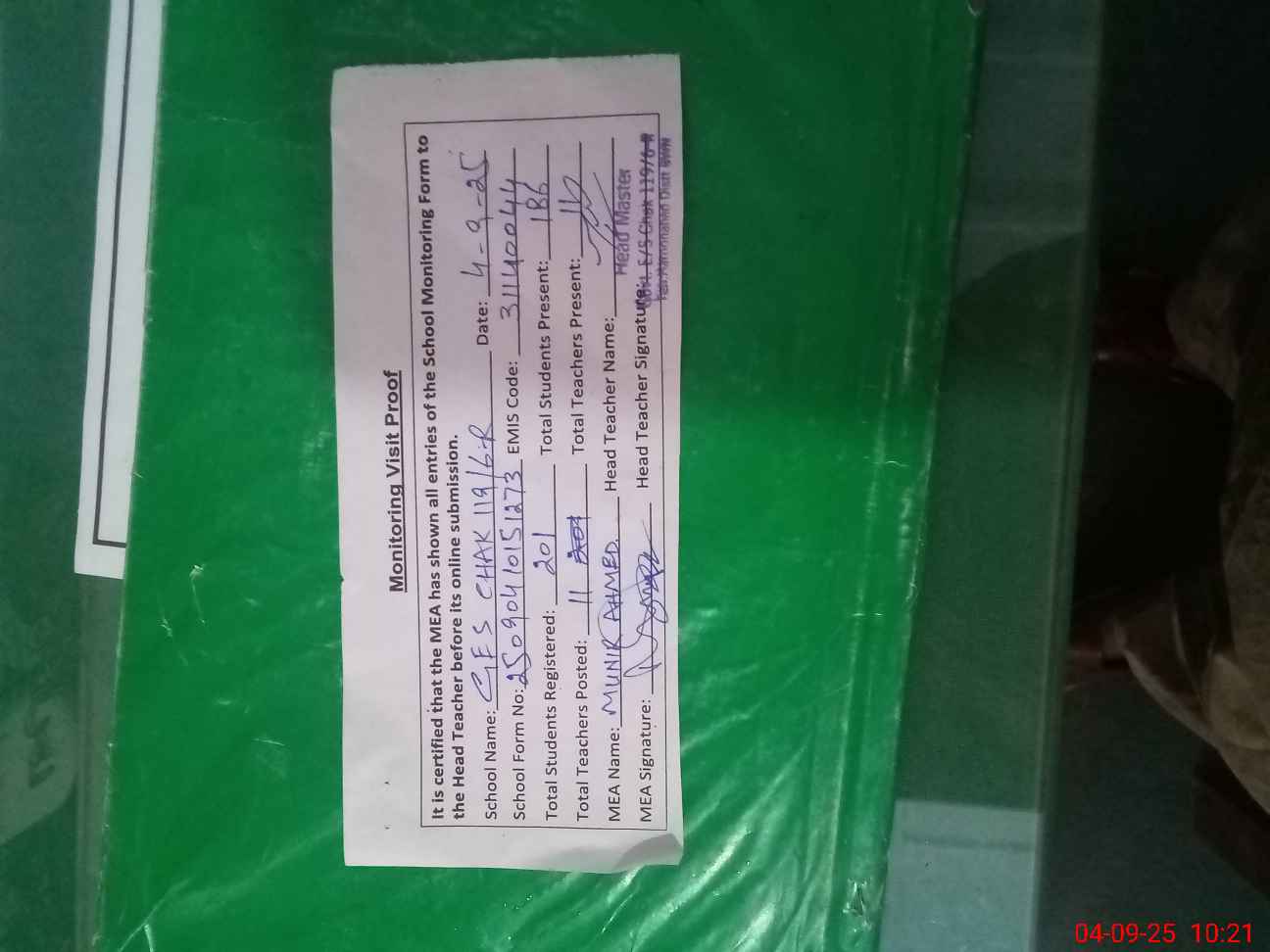| Attendance Register | Head Teacher | MEA with School | Visit Proof |