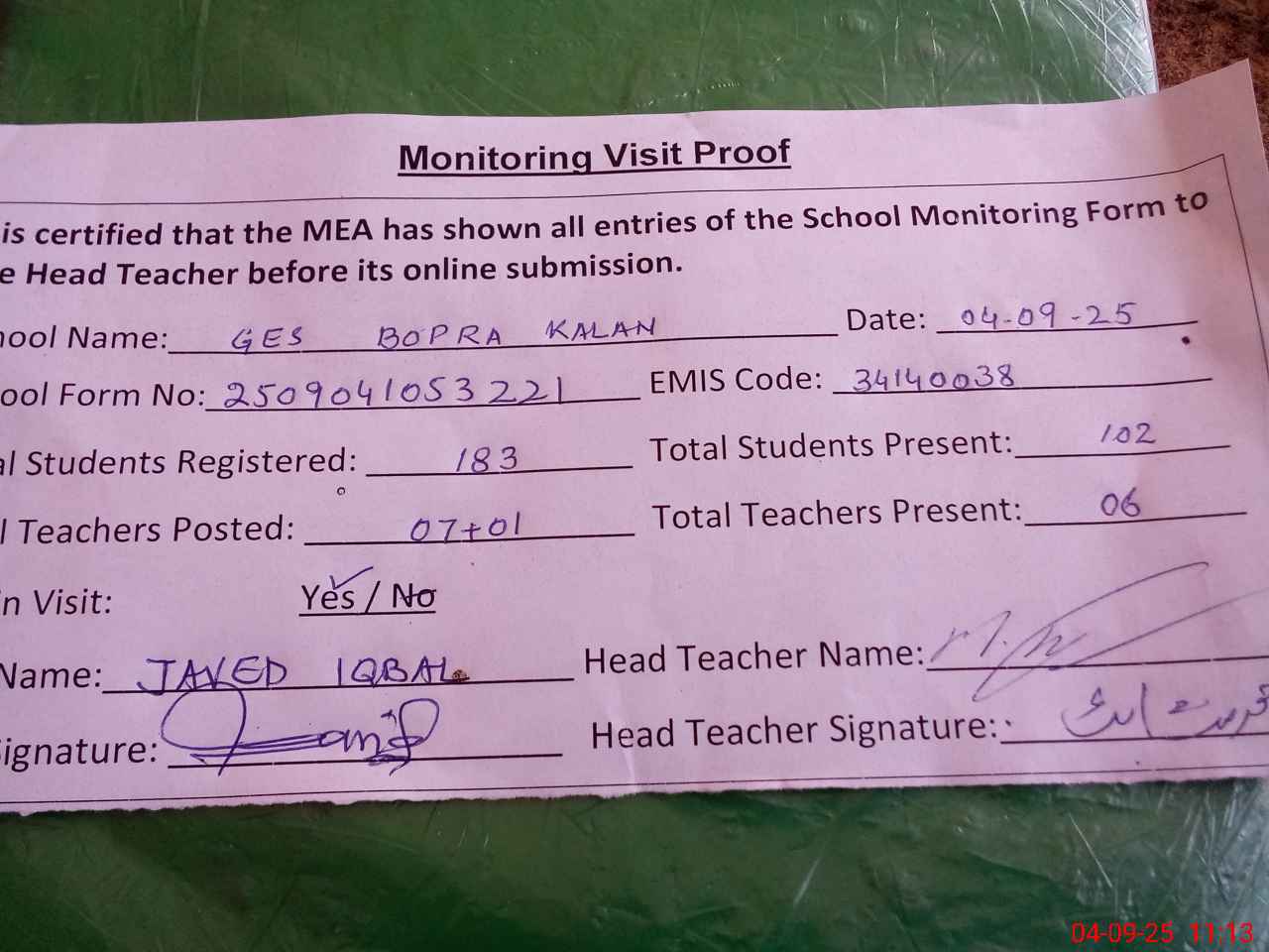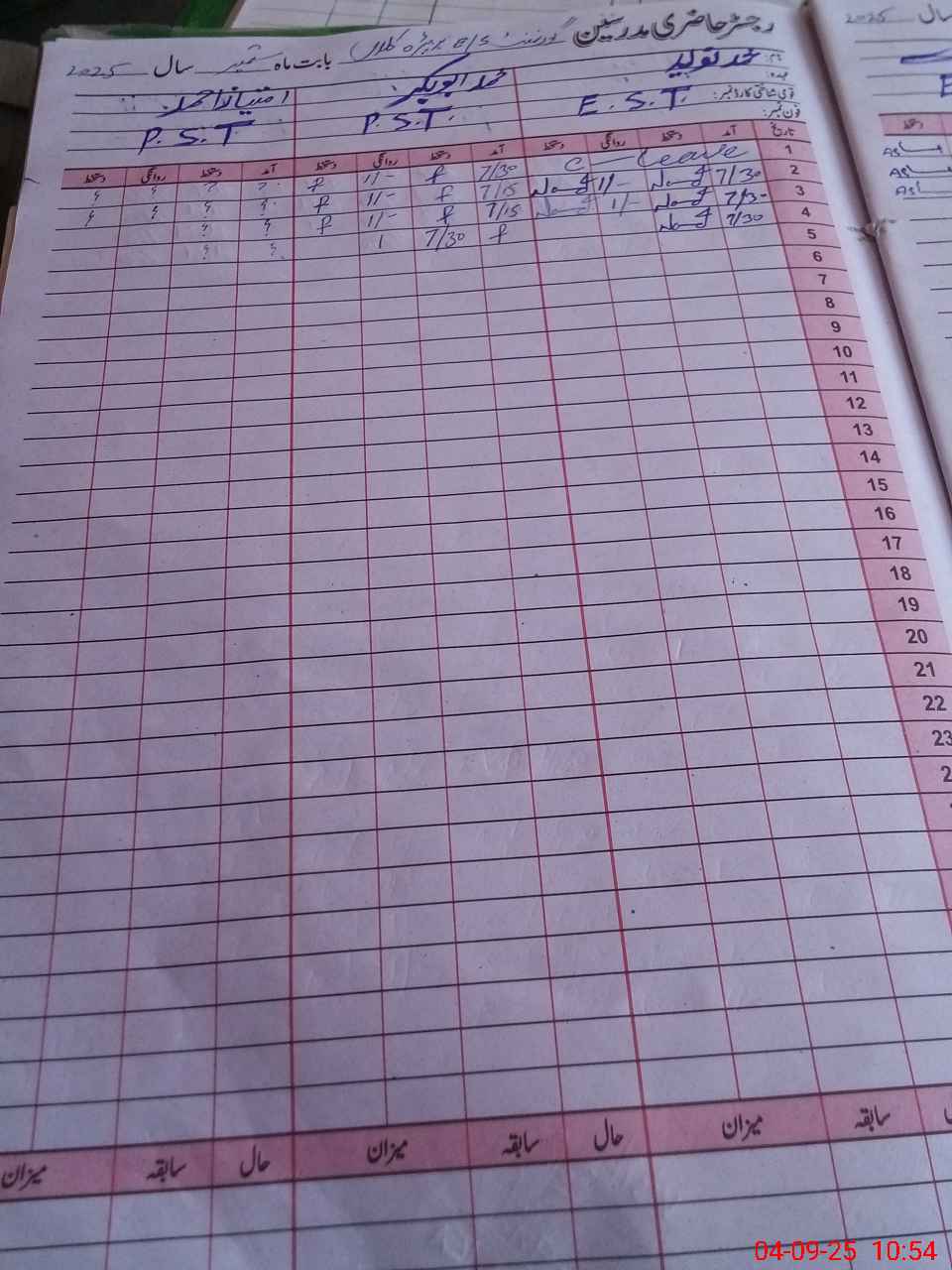 | Remarks (Use Separate Page if Required): Mr Imtiaz Ahmad PST is absent since 01 Sep 2025 Rainy water is stationed in the ground | |||||