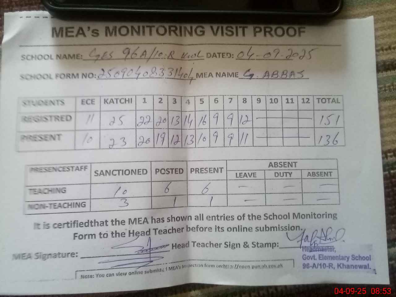 | Attendance Register | Head Teacher | MEA with School | Visit Proof |