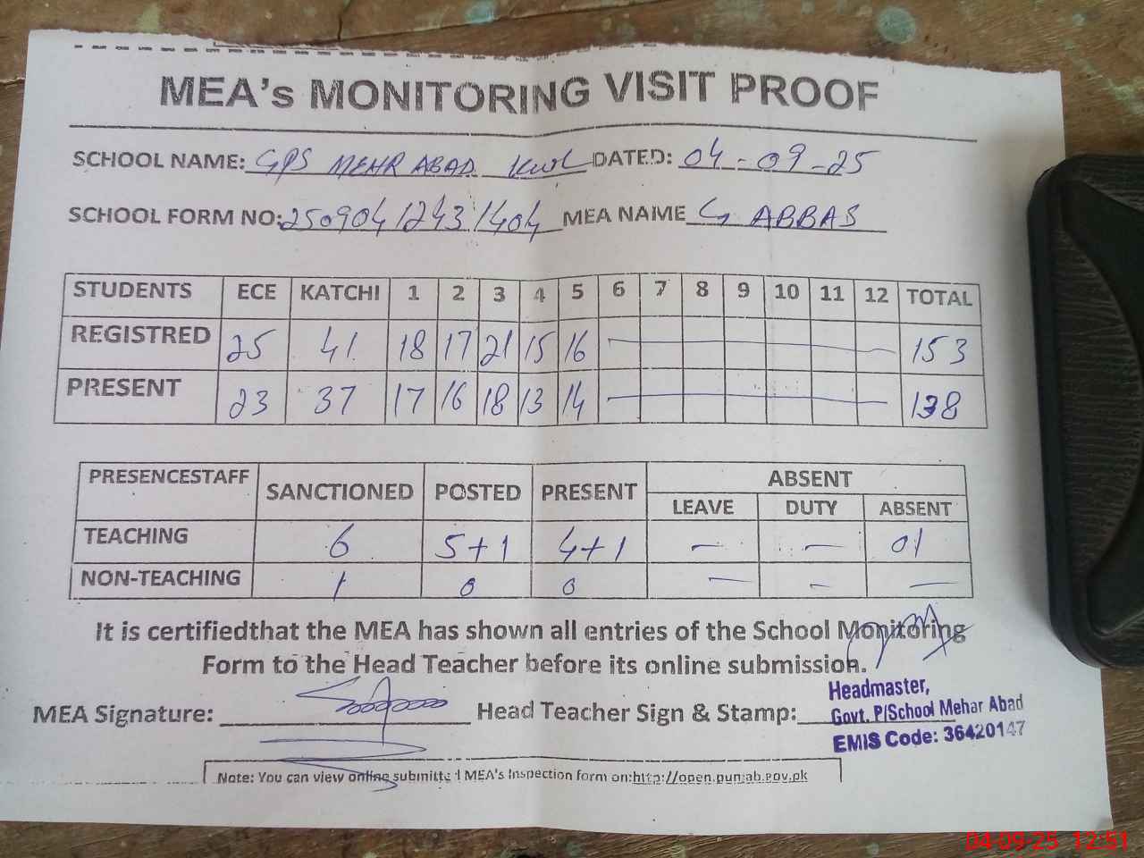| EMIS Code: 36420147 | Name of School: GPS MEHAR ABAD, KHANEWAL | |||