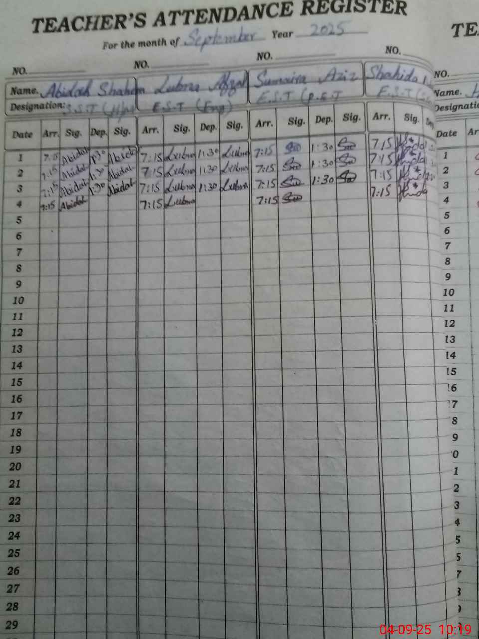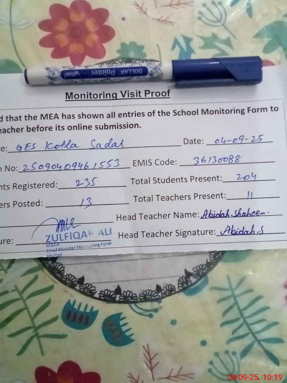 | Monitoring Date: 04-09-2025 | Start Time: 04-09-2025 09:46 AM | End Time: 04-09-2025 10:20 AM | Name of MEA: Zu**** Al**** | |