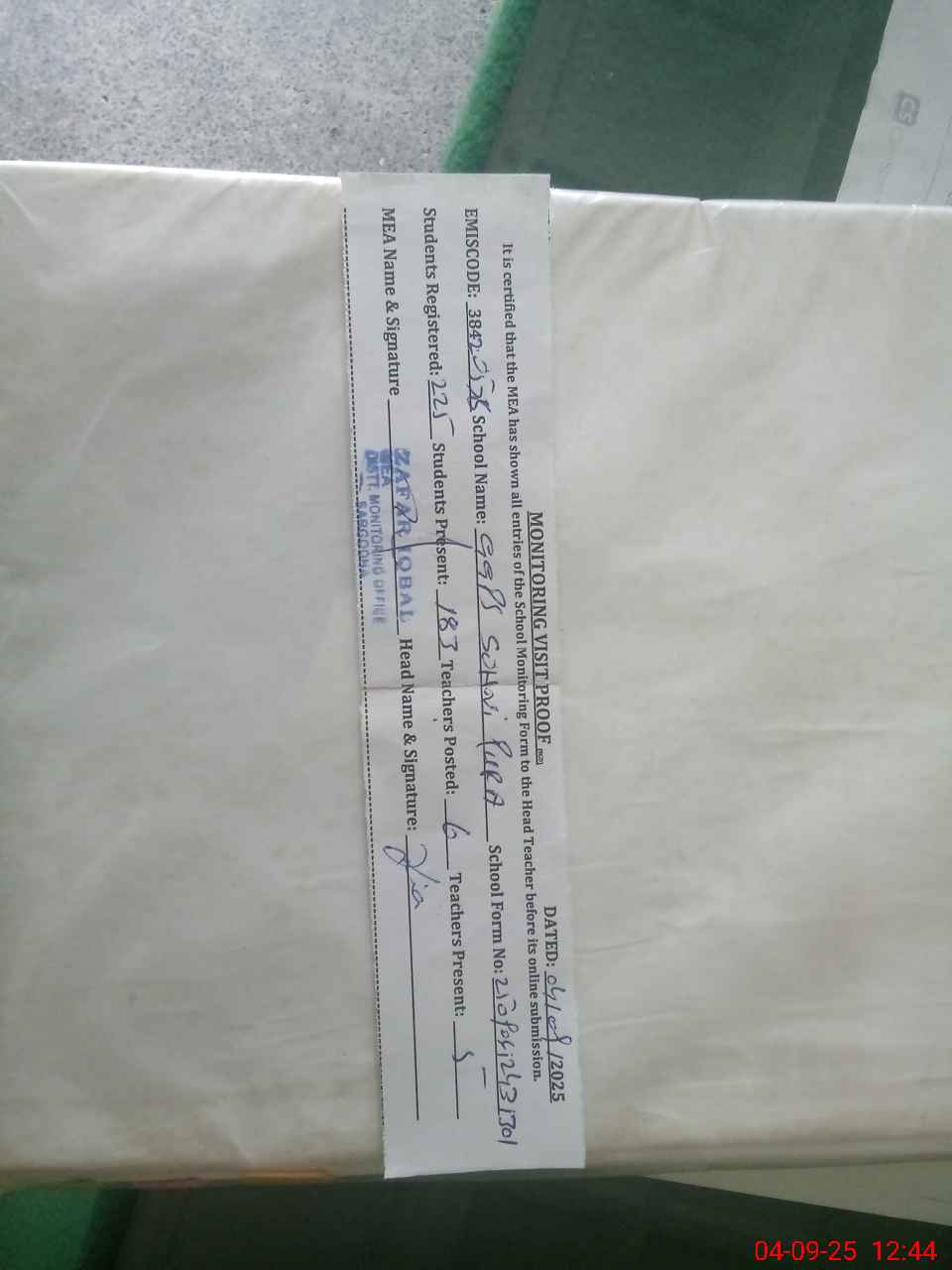 | Attendance Register | Head Teacher | MEA with School | Visit Proof |