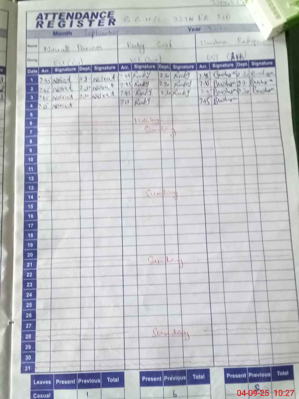 | 33**** | Ub**** | CHOKIDAR | Regular | 0 | 0 | 1 | 0 | 0 | 0 | 0 | 0 | 0 | Absent (Un-Authorized) |