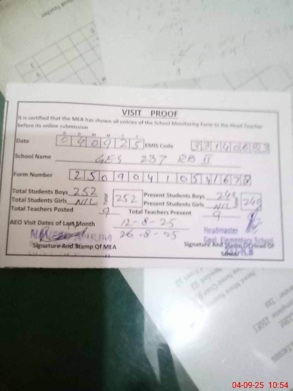 | Attendance Register | Head Teacher | MEA with School | Visit Proof |