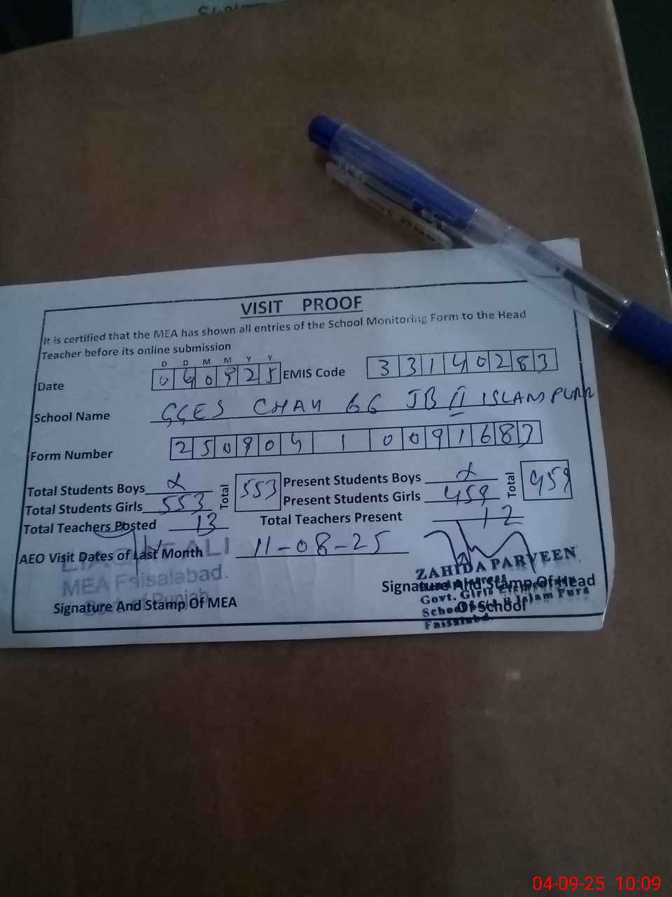 | Attendance Register | Head Teacher | MEA with School | Visit Proof |