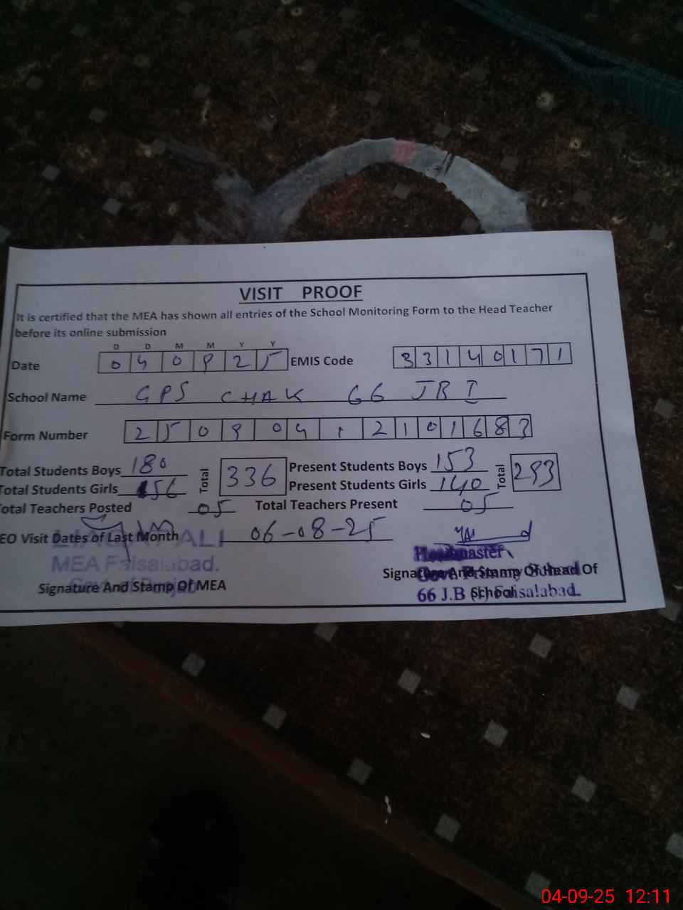 | Attendance Register | Head Teacher | MEA with School | Visit Proof |