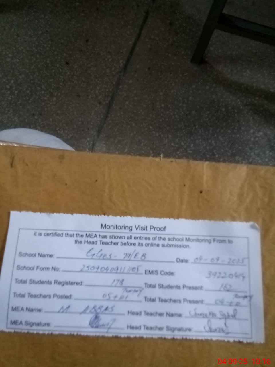 | Attendance Register | Head Teacher | MEA with School | Visit Proof |