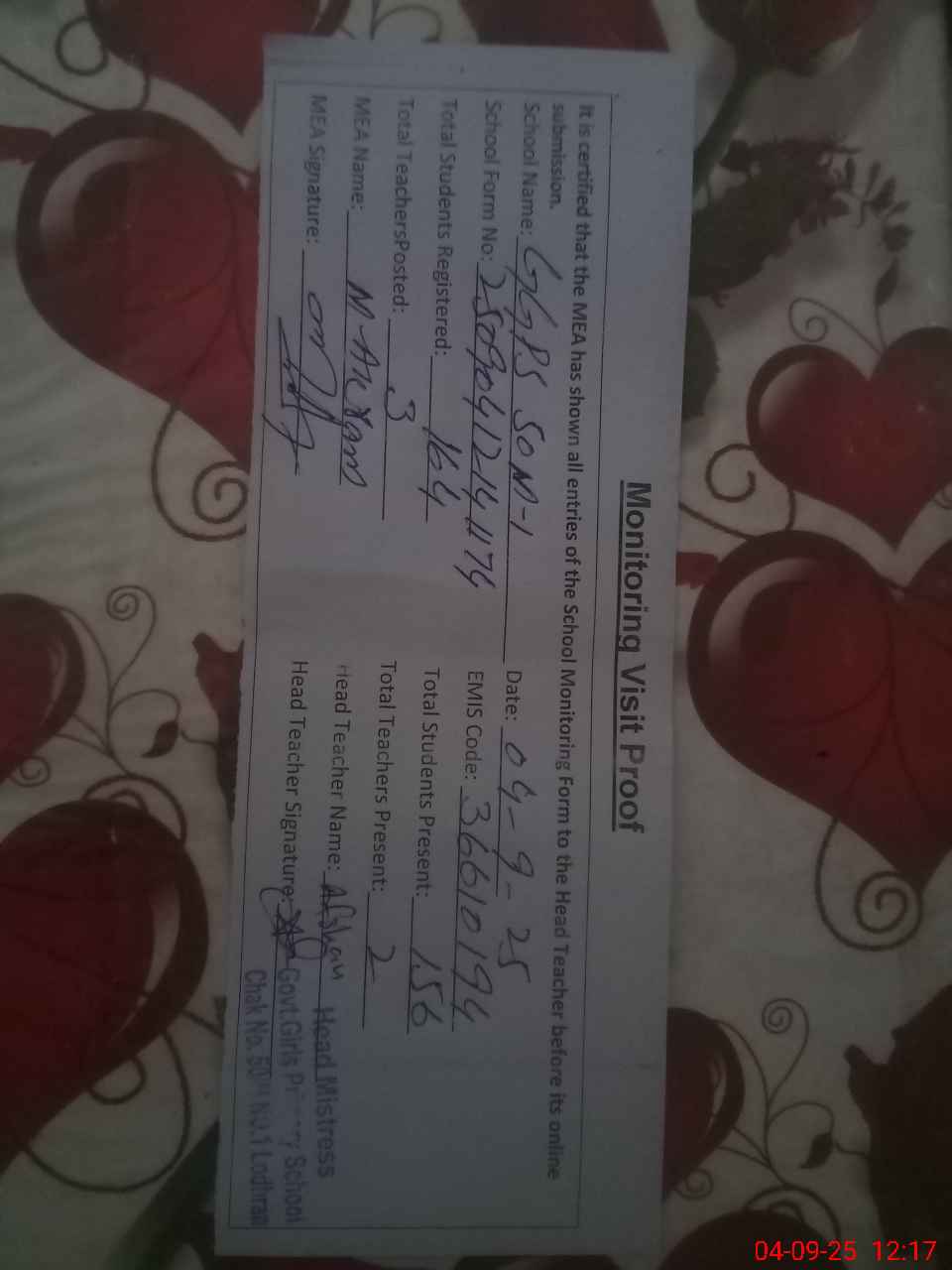 | District: LODHRAN | Tehsil: LODHRAN | Markaz: MIRAN PUR - FEMALE | Level: Primary | |