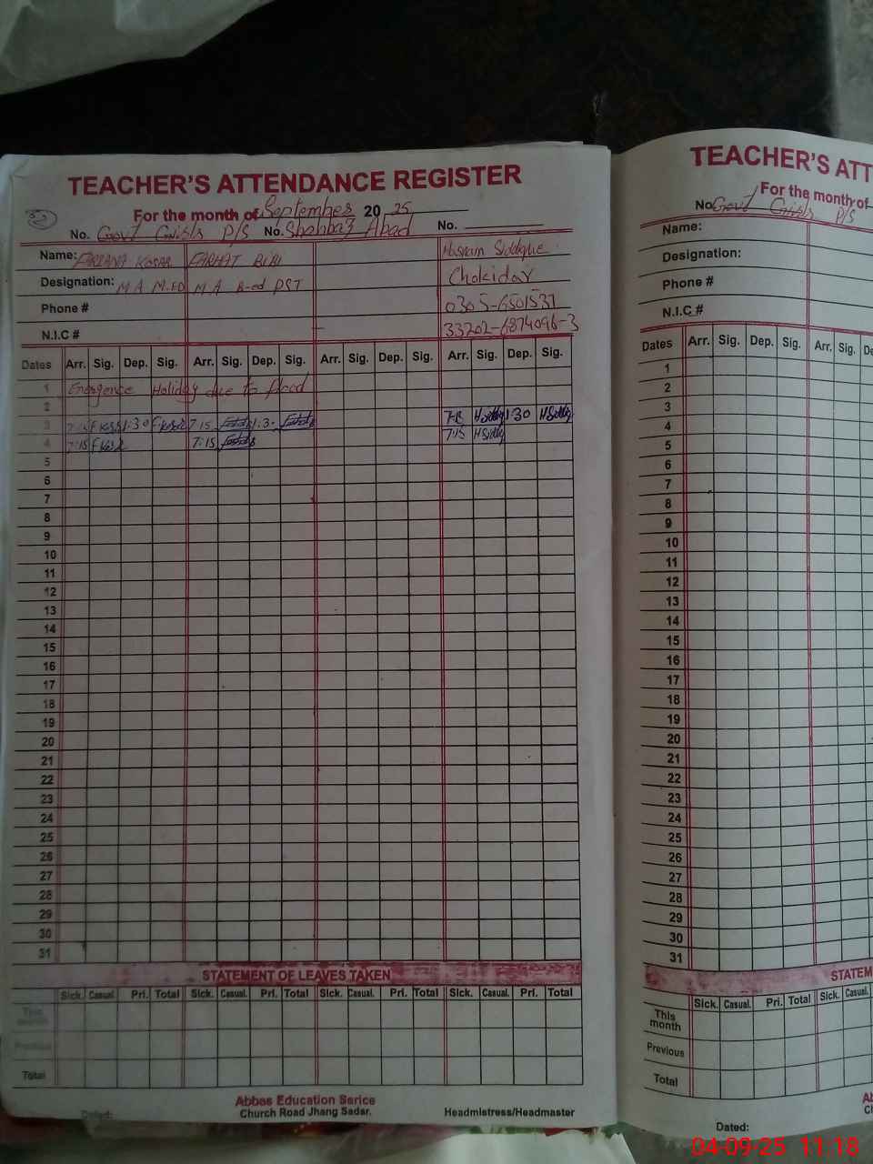 | Name: Fa**** Ko**** Designation: (School Headmaster's/Headmistress's) PST Phone/Cell Number: 03**** |