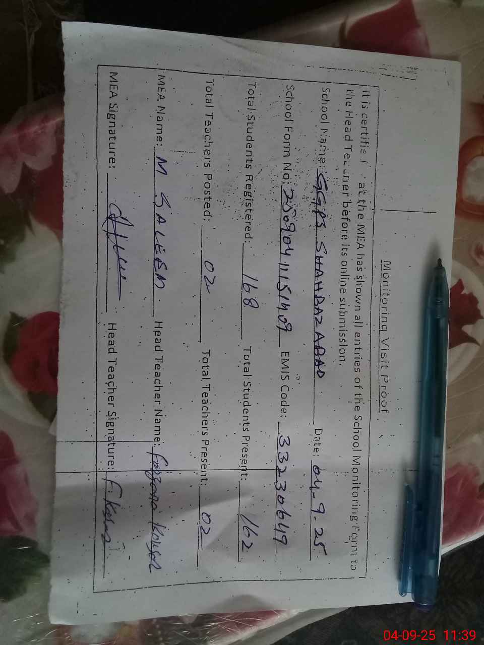| Attendance Register | Head Teacher | MEA with School | Visit Proof |