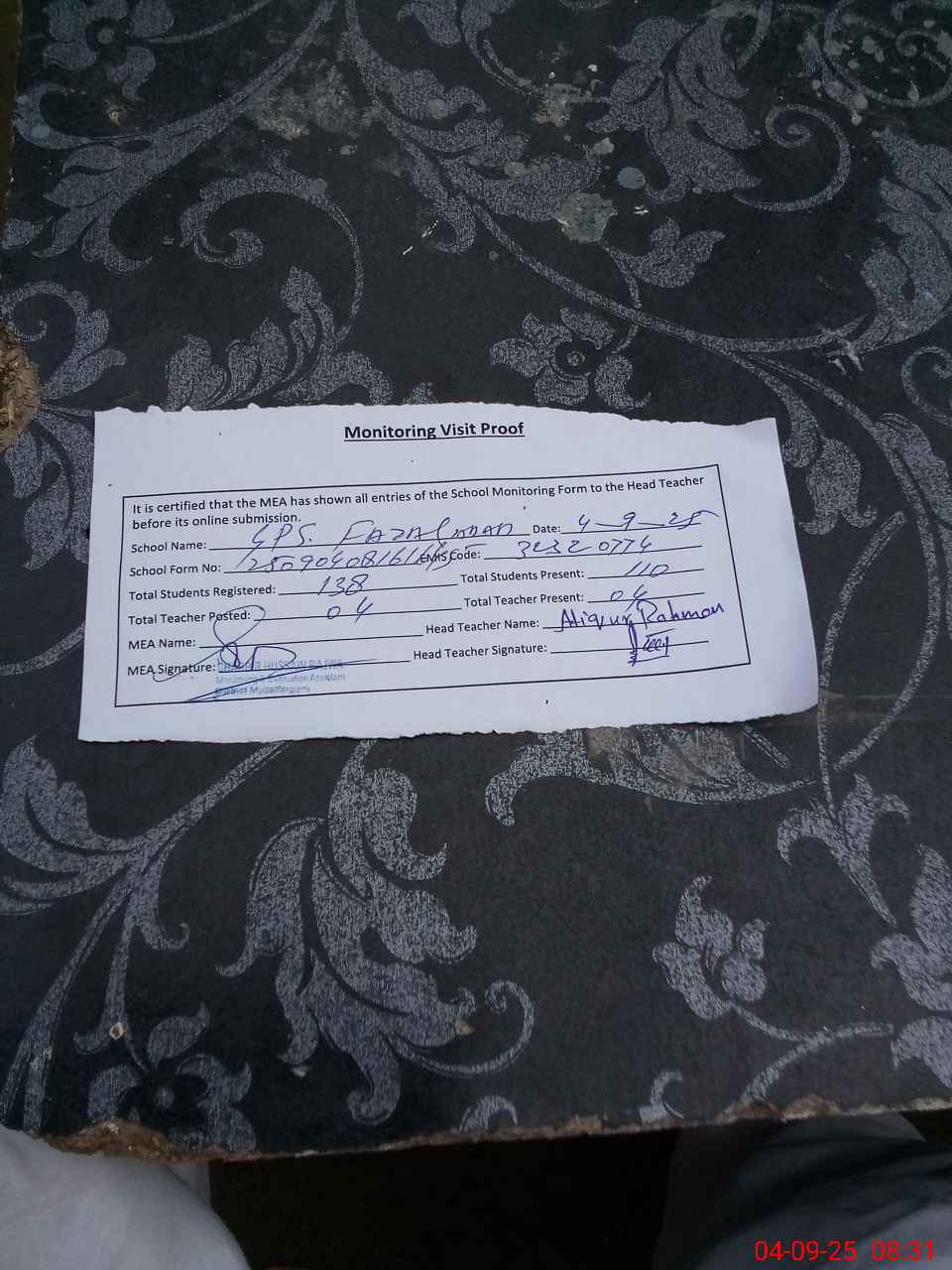 | Attendance Register | Head Teacher | MEA with School | Visit Proof |