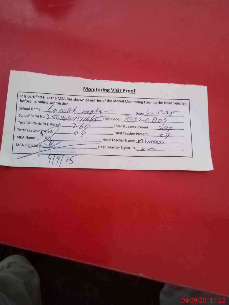 | Attendance Register | Head Teacher | MEA with School | Visit Proof |