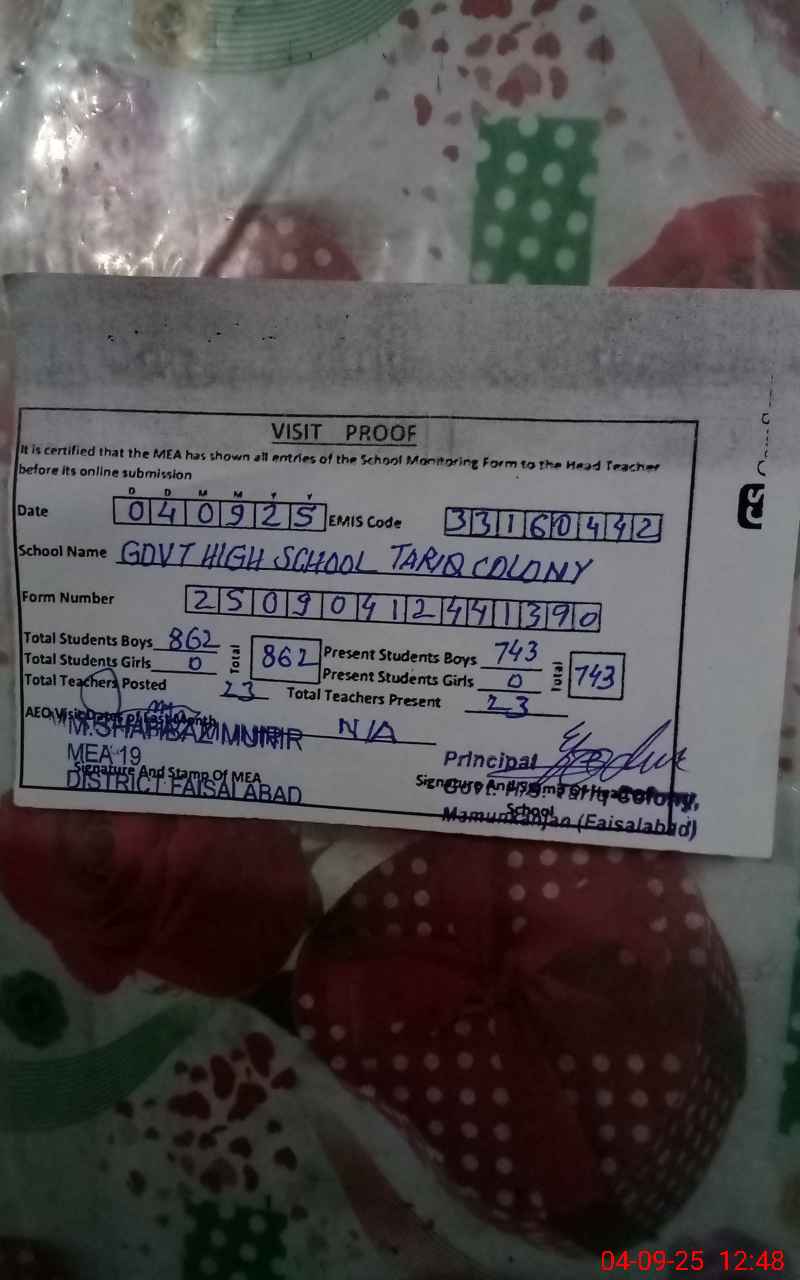 | EMIS Code: 33160442 | Name of School: GHS TARIQ COLONY MAMUNKANJAN | |||