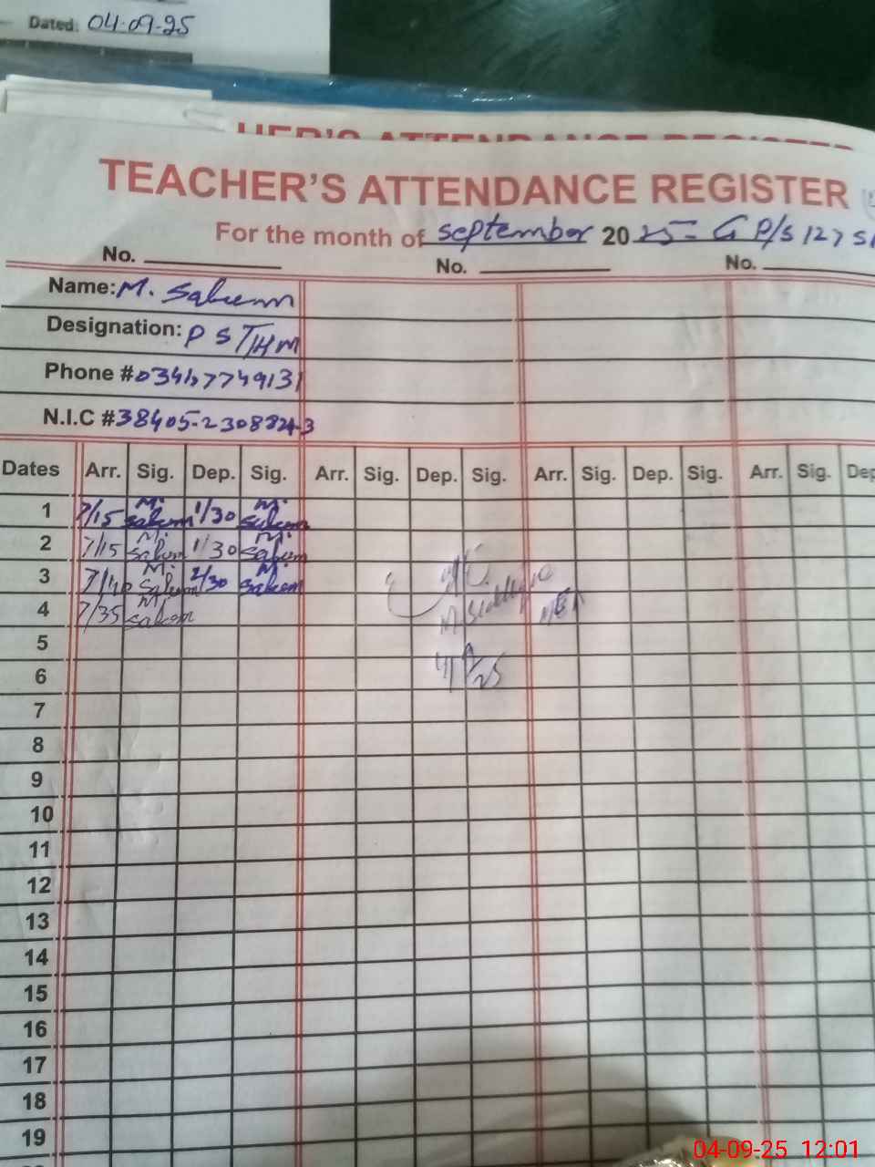 | Name: Mu**** Sa**** Designation: (School Headmaster's/Headmistress's) PST Phone/Cell Number: 03**** |