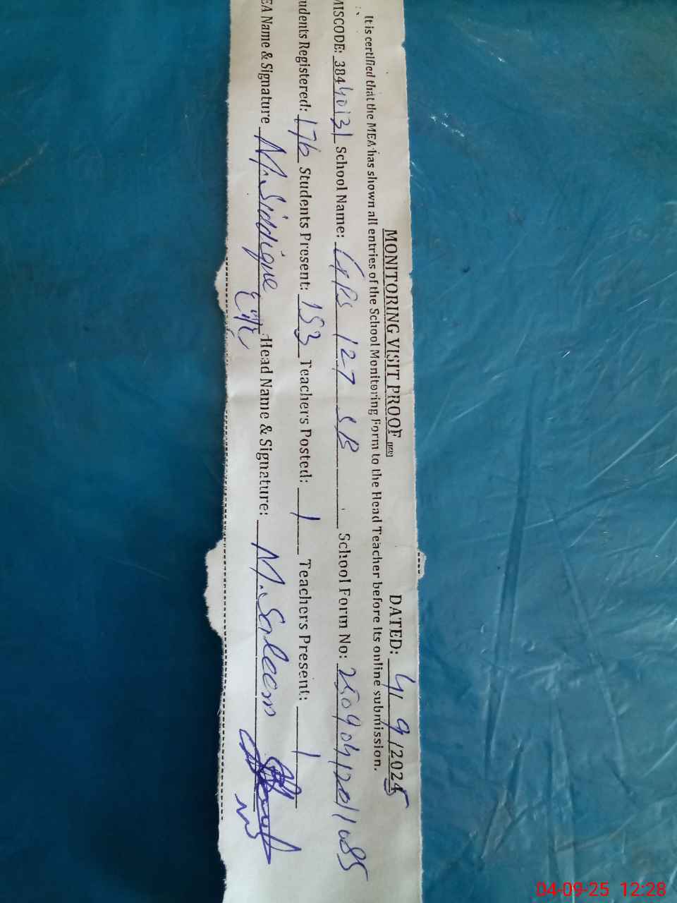 | Attendance Register | Head Teacher | MEA with School | Visit Proof |