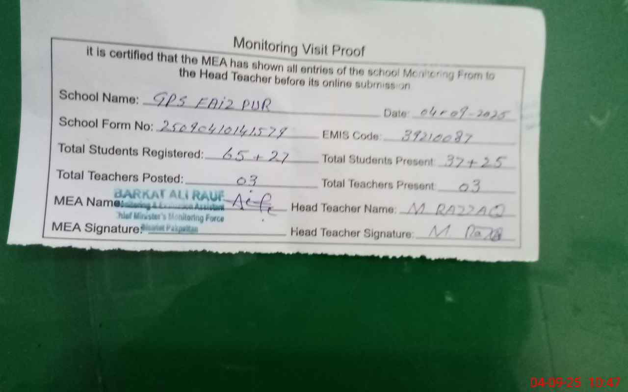 | Attendance Register | Head Teacher | MEA with School | Visit Proof |