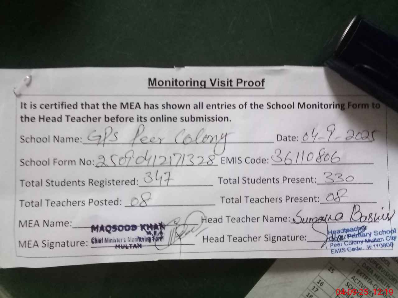 | Attendance Register | Head Teacher | MEA with School | Visit Proof |
