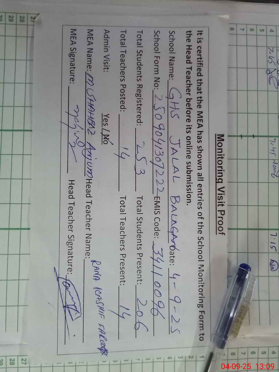 | Attendance Register | Head Teacher | MEA with School | Visit Proof |