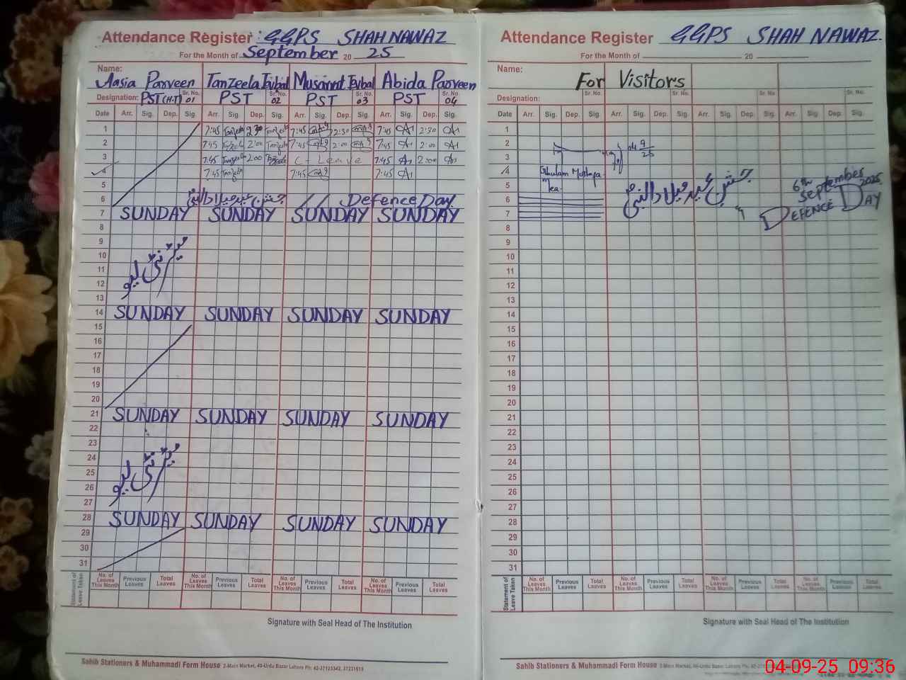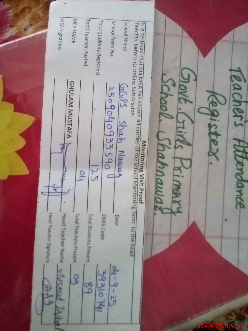 | Attendance Register | Head Teacher | MEA with School | Visit Proof |