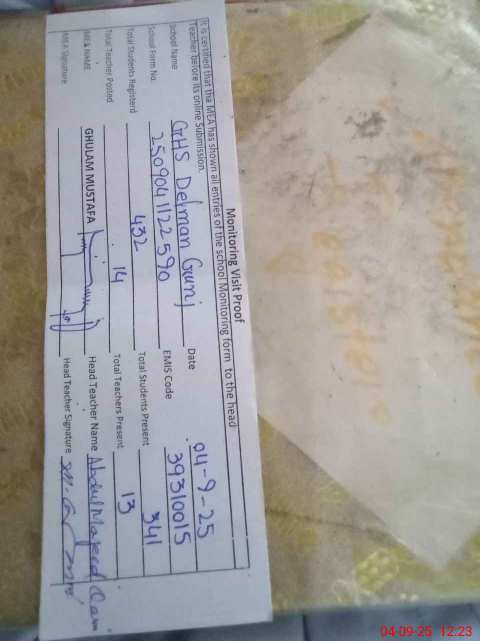 | Attendance Register | Head Teacher | MEA with School | Visit Proof |
