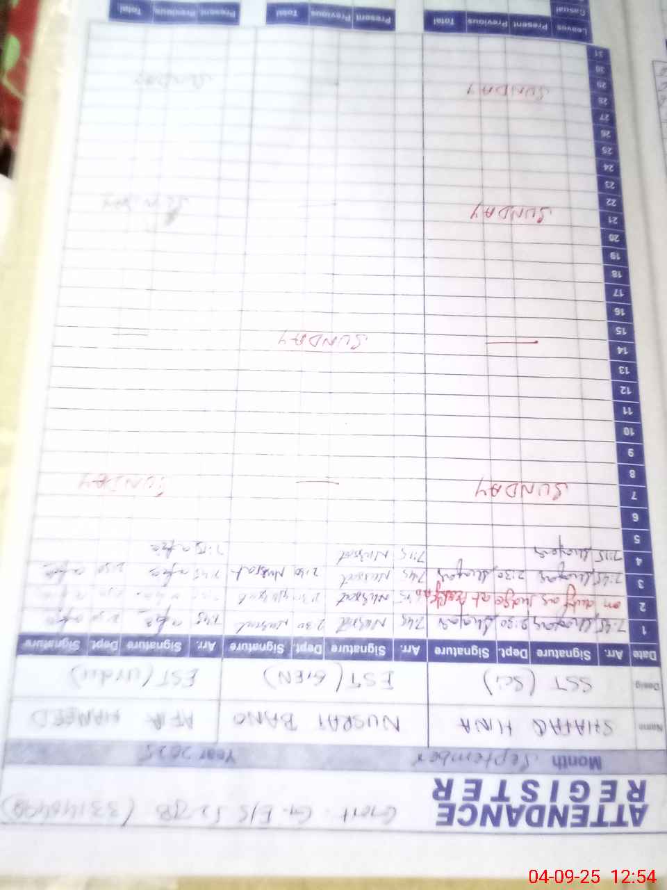 | CNIC | Full Name | Designation | R/C | Absence During Last Calender Month |
