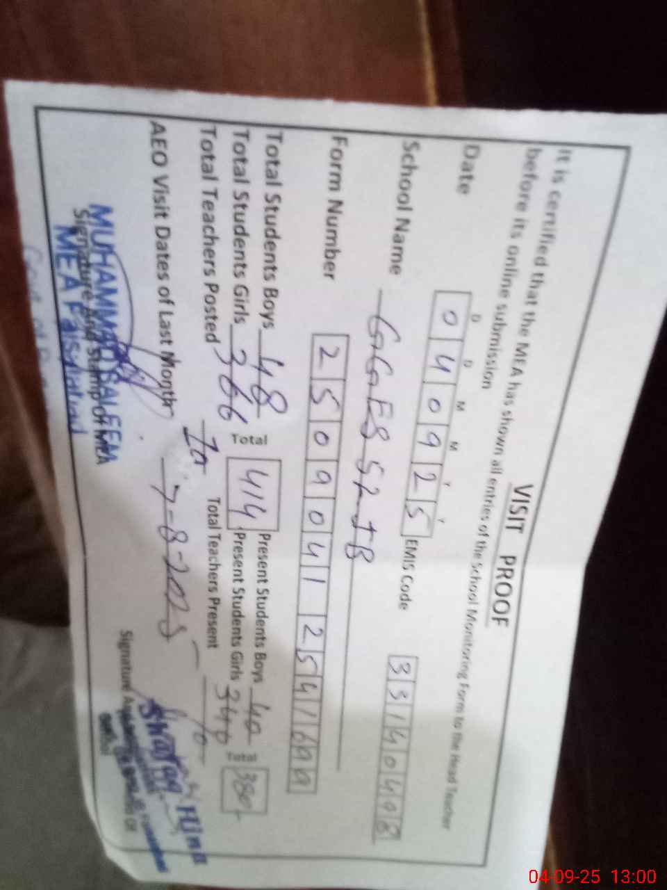 | Attendance Register | Head Teacher | MEA with School | Visit Proof |