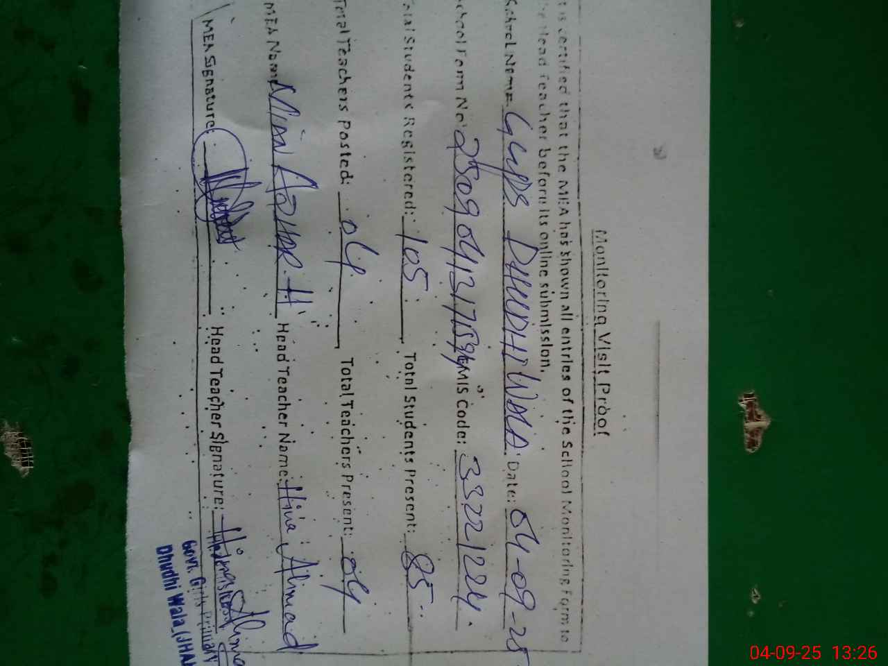 | EMIS Code: 33221224 | Name of School: GGPS DHUDHI WALA | |||