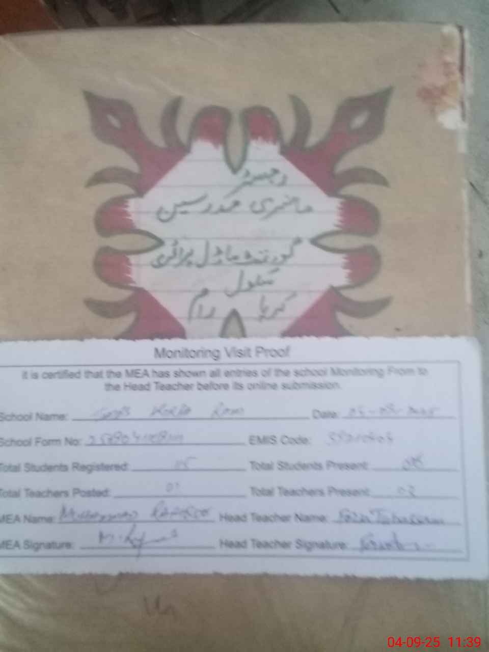 | Attendance Register | Head Teacher | MEA with School | Visit Proof |