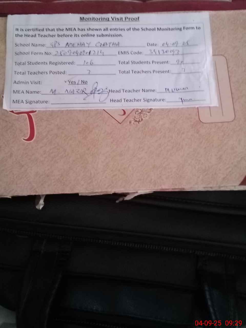 | Attendance Register | Head Teacher | MEA with School | Visit Proof |