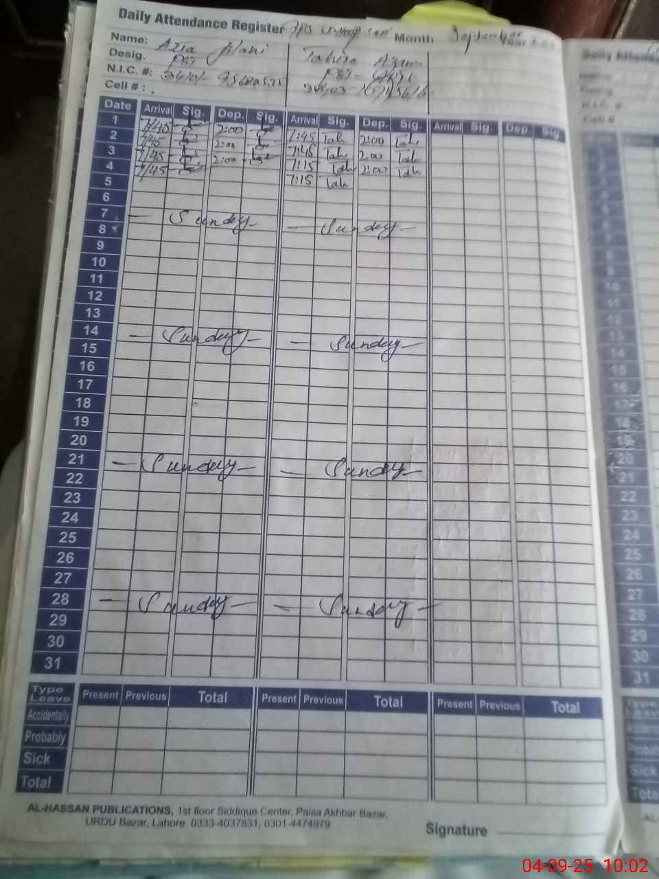 | CNIC | Full Name | Designation | R/C | Absence During Last Calender Month |