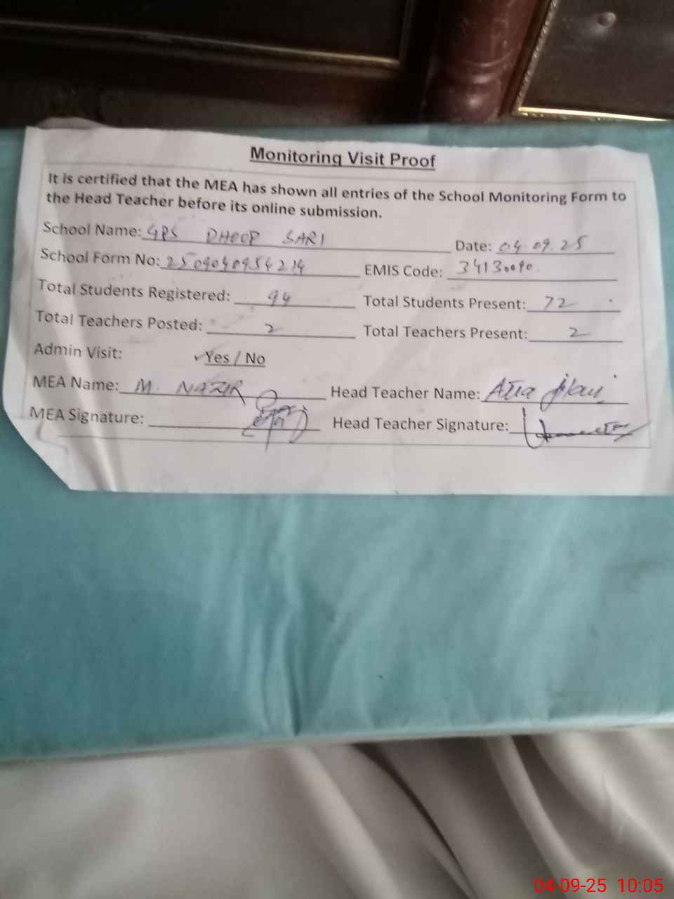 | Attendance Register | Head Teacher | MEA with School | Visit Proof |