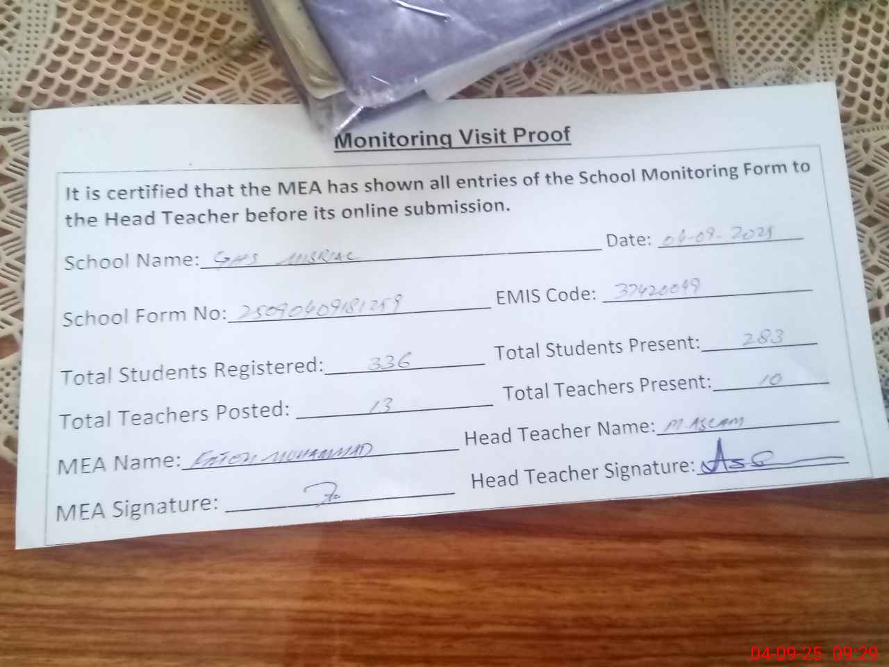 | Attendance Register | Head Teacher | MEA with School | Visit Proof |