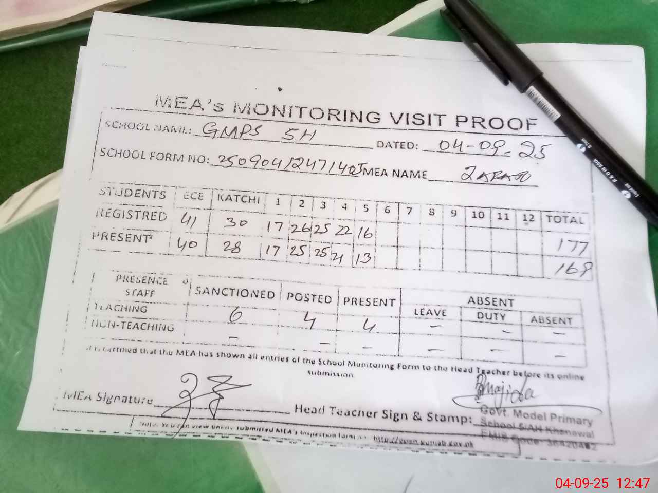 | Attendance Register | Head Teacher | MEA with School | Visit Proof |