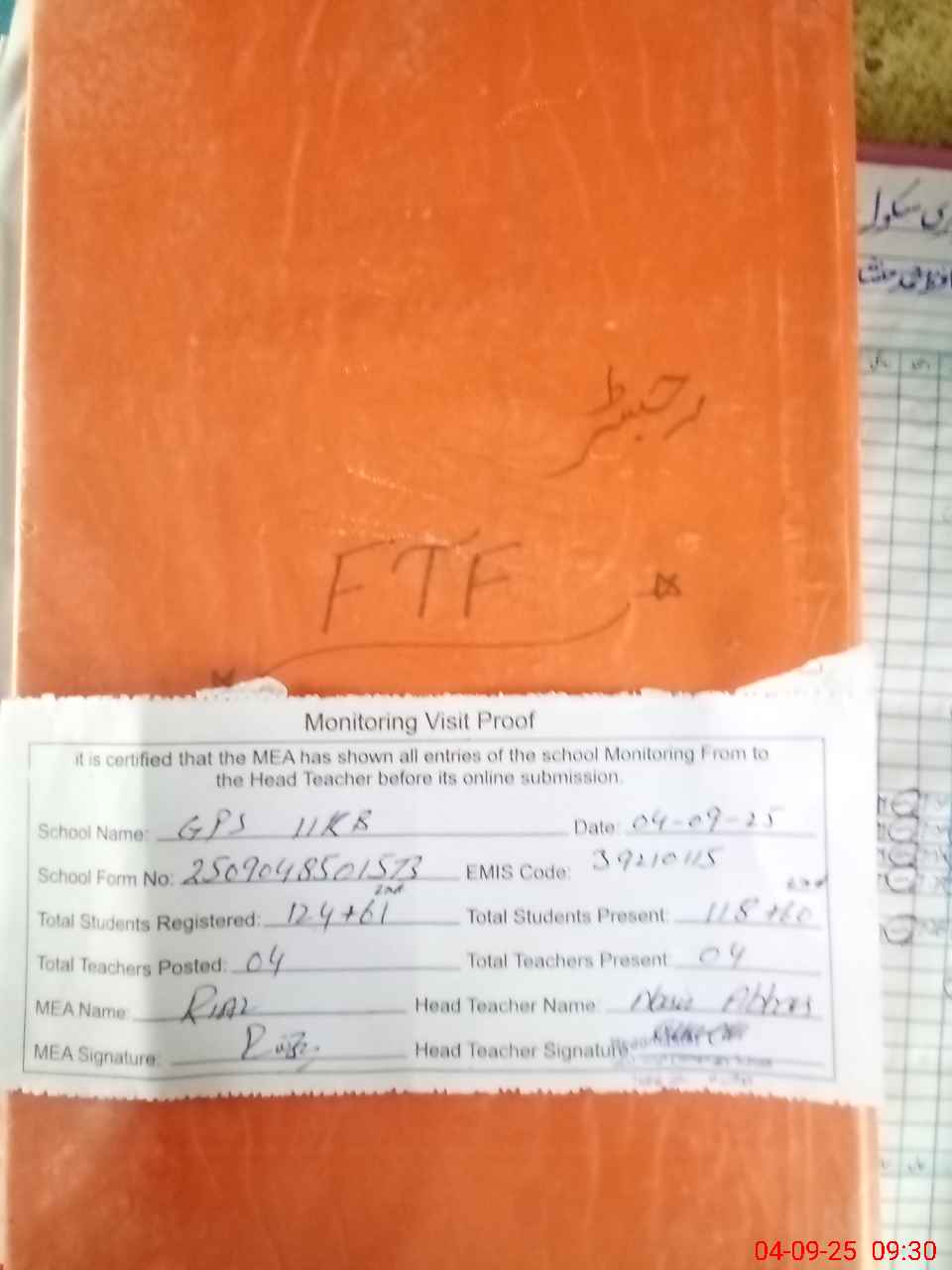 | Attendance Register | Head Teacher | MEA with School | Visit Proof |