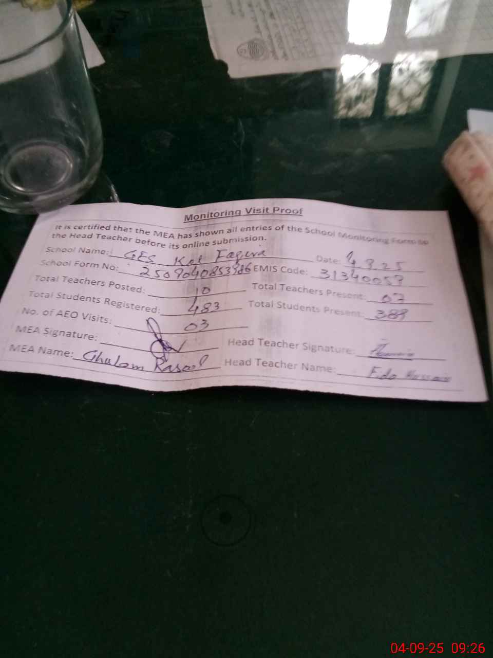 | Attendance Register | Head Teacher | MEA with School | Visit Proof |