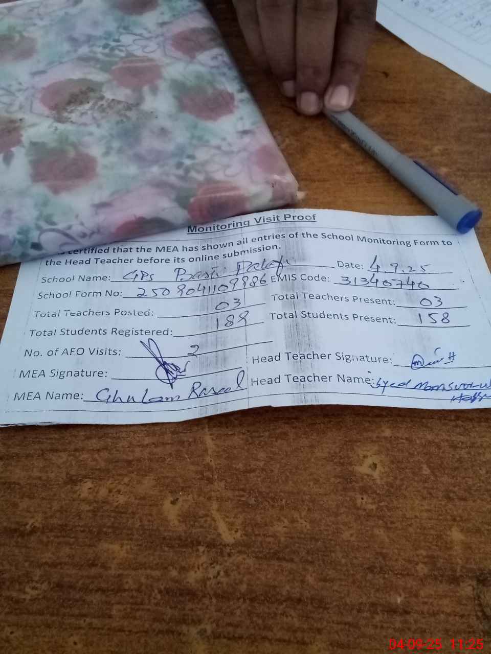| Attendance Register | Head Teacher | MEA with School | Visit Proof |