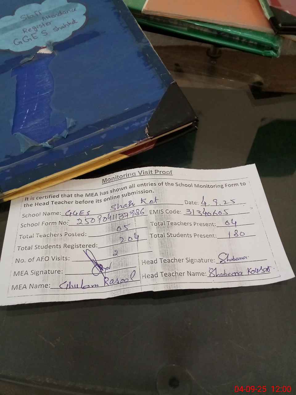 | Attendance Register | Head Teacher | MEA with School | Visit Proof |