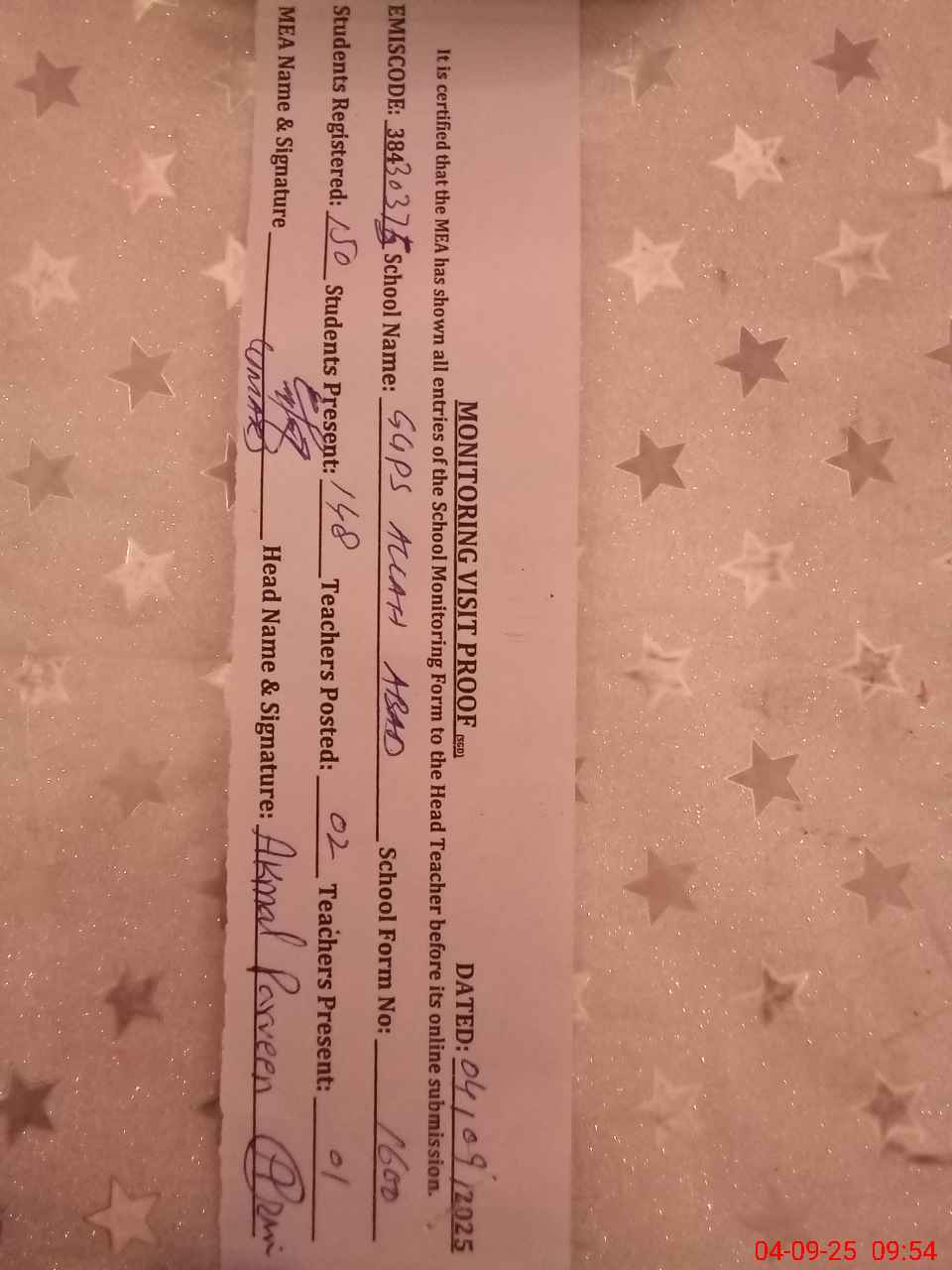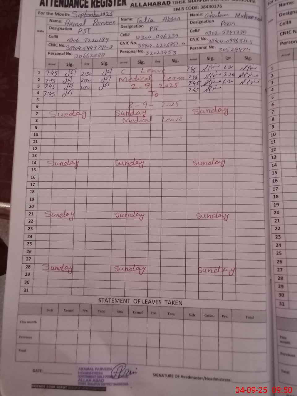 | Name: AK**** PA**** Designation: (School Headmaster's/Headmistress's) PST Phone/Cell Number: 03**** |