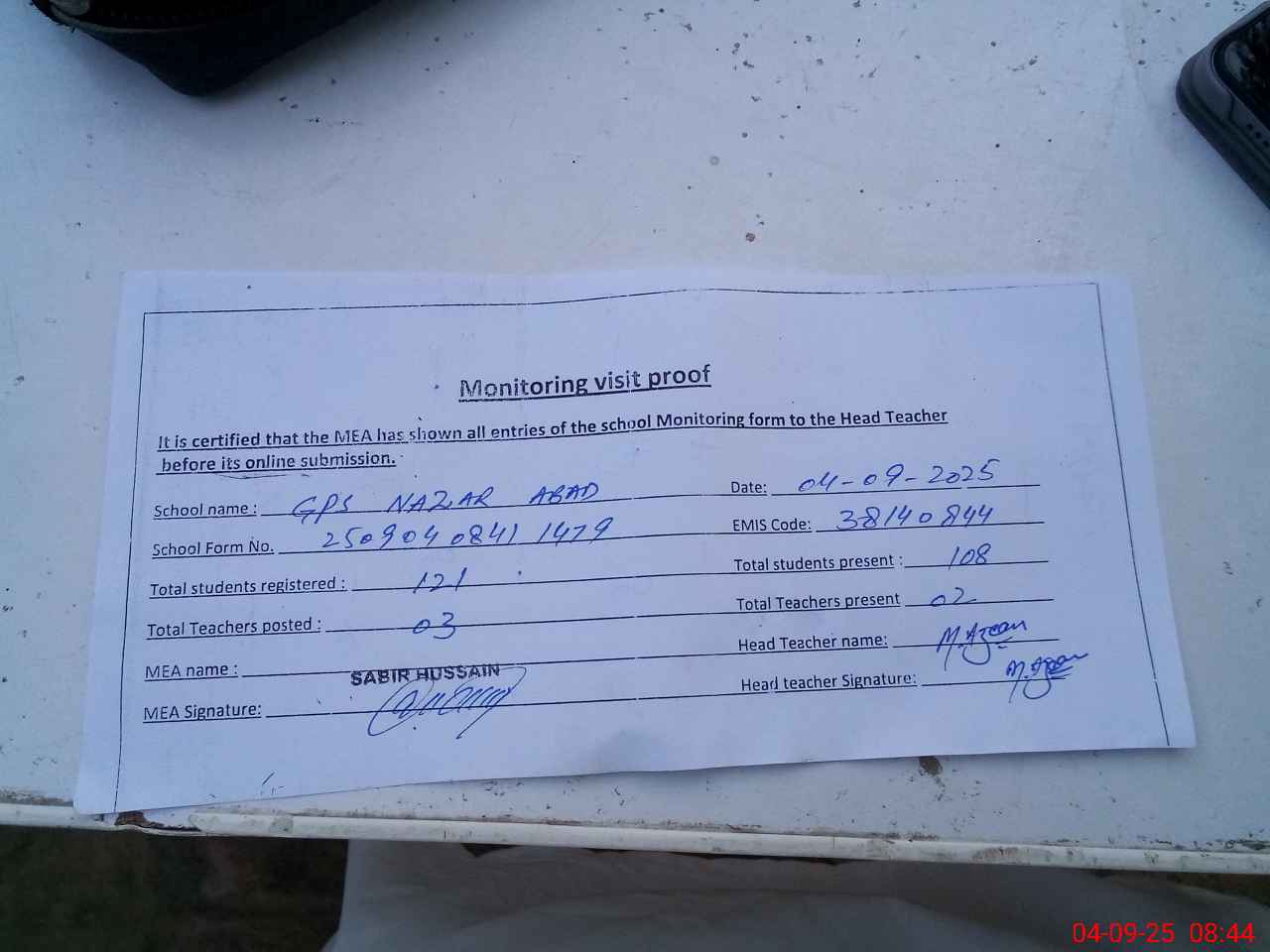 | Attendance Register | Head Teacher | MEA with School | Visit Proof |
