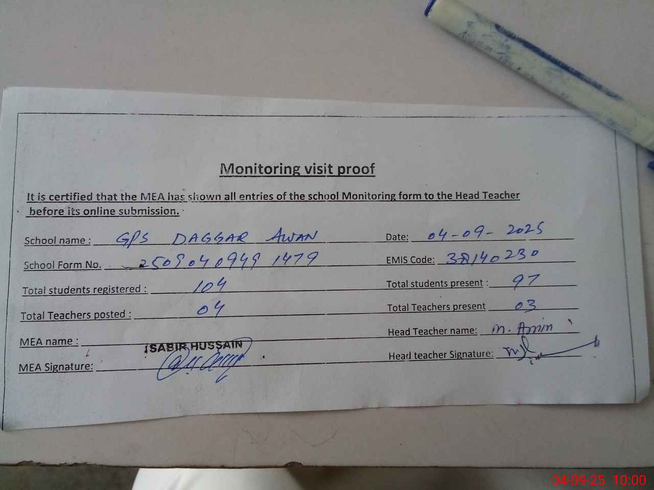 | EMIS Code: 38140230 | Name of School: GPS DAGGAR AWAN | |||