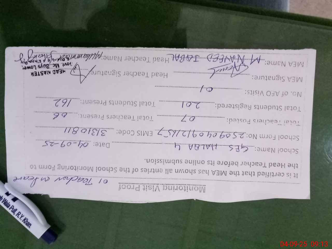 | Attendance Register | Head Teacher | MEA with School | Visit Proof |