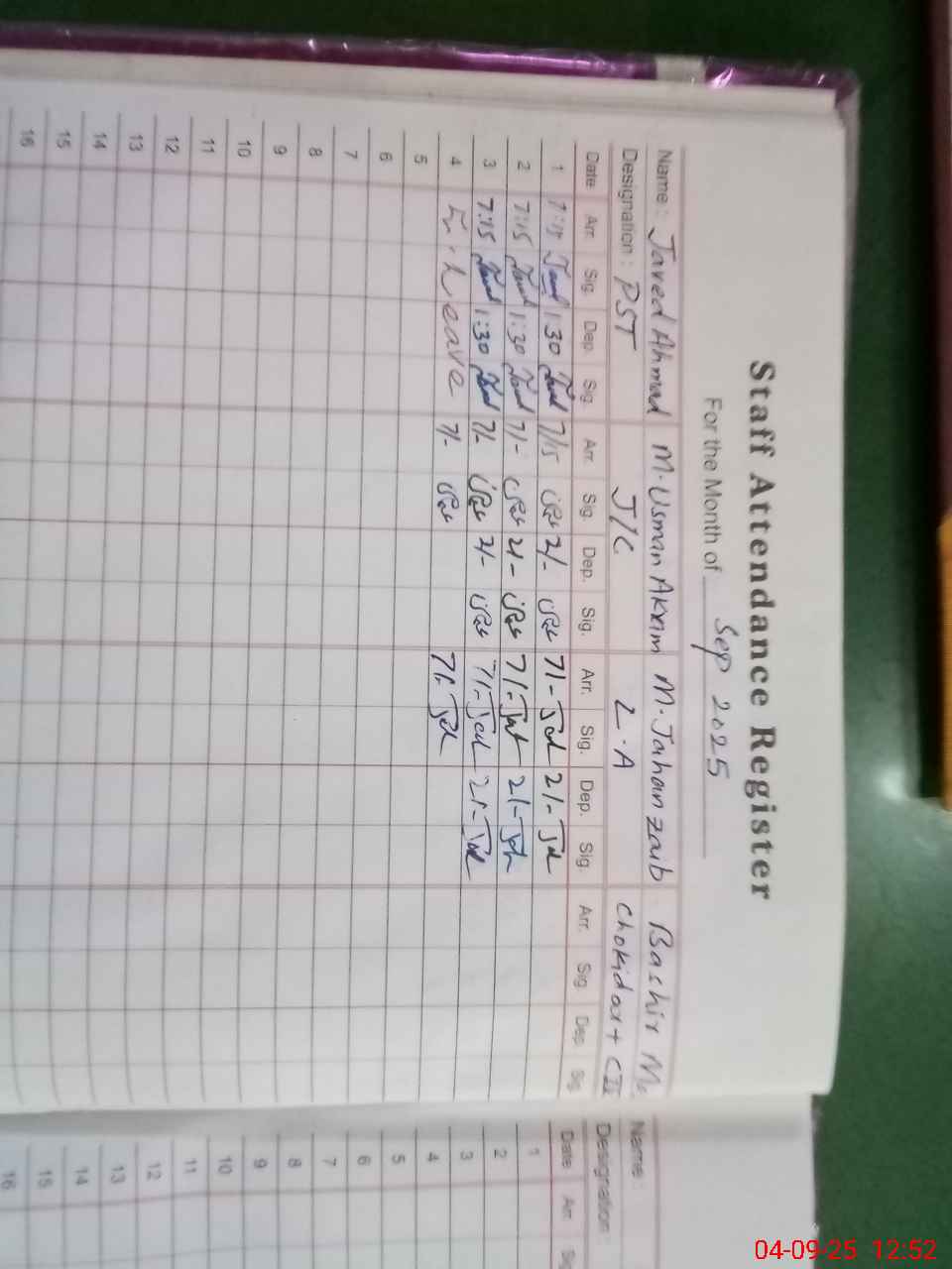 | CNIC | Full Name | Designation | R/C | Absence During Last Calender Month |
