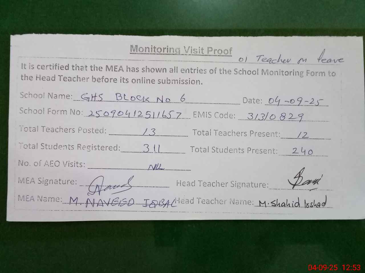 | Attendance Register | Head Teacher | MEA with School | Visit Proof |