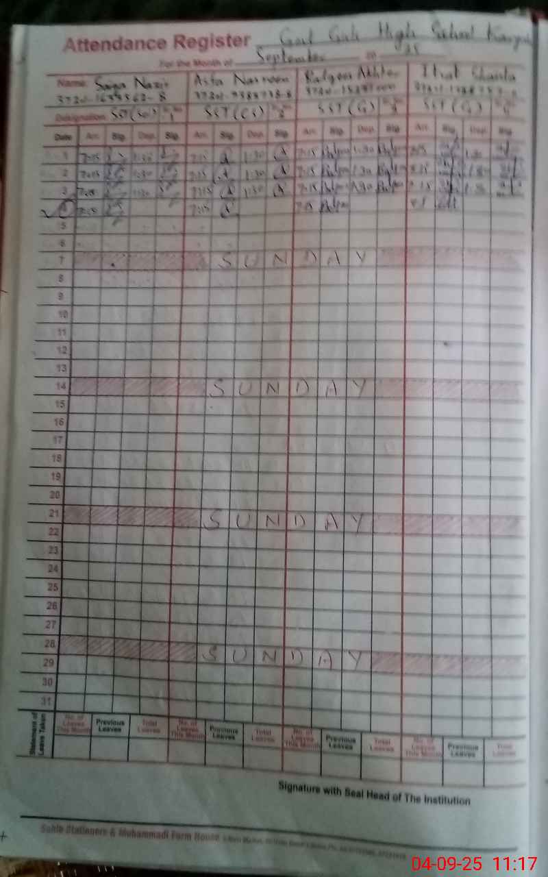 | CNIC | Full Name | Designation | R/C | Absence During Last Calender Month |