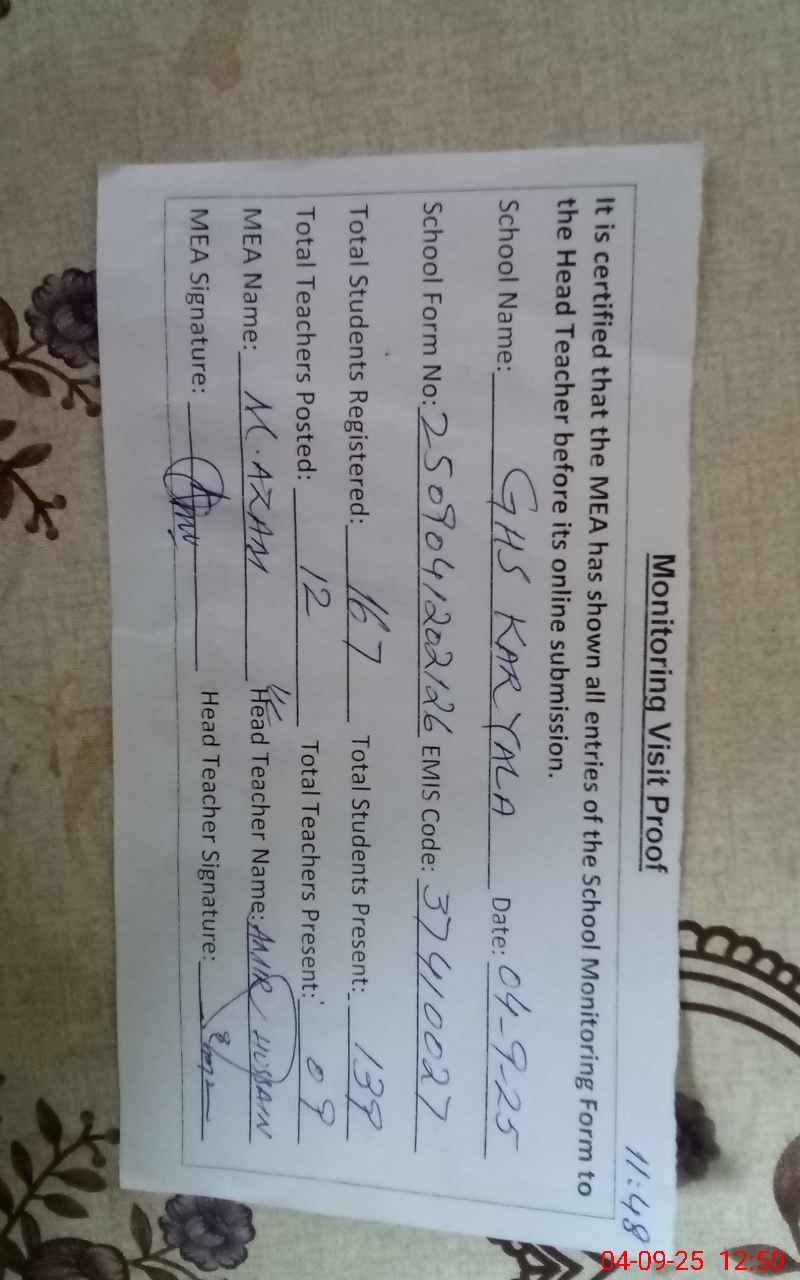 | Attendance Register | Head Teacher | MEA with School | Visit Proof |