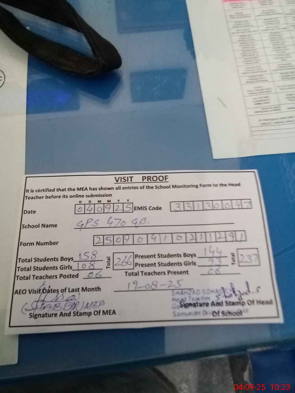 | Attendance Register | Head Teacher | MEA with School | Visit Proof |