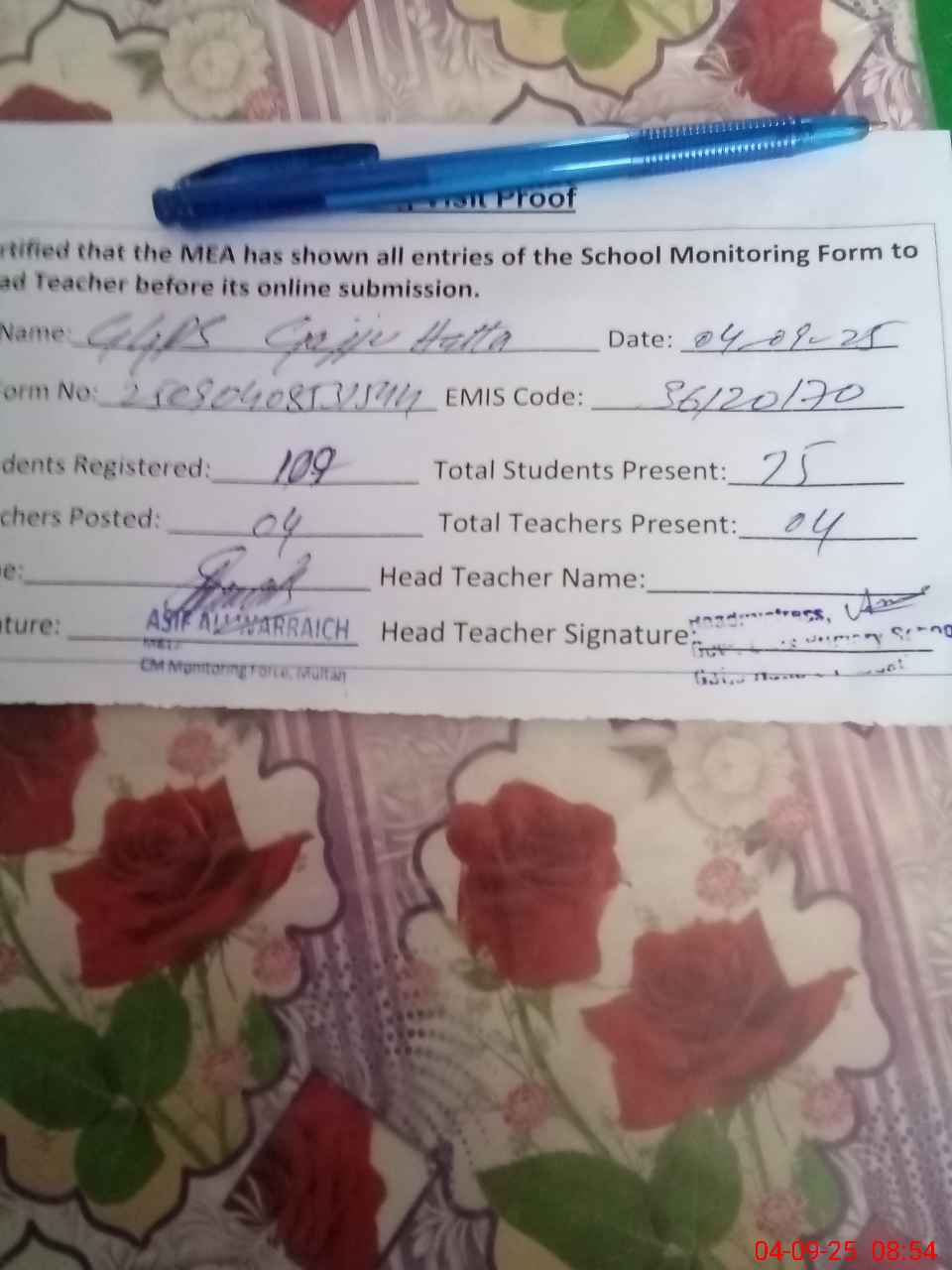 | Attendance Register | Head Teacher | MEA with School | Visit Proof |