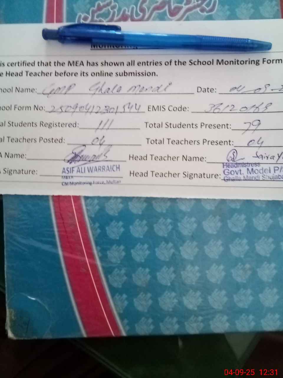 | Attendance Register | Head Teacher | MEA with School | Visit Proof |